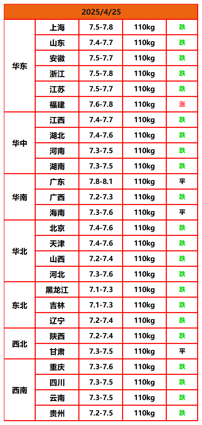 2025年4月25日猪价,今日全国猪价行情走势:1涨3平22跌。