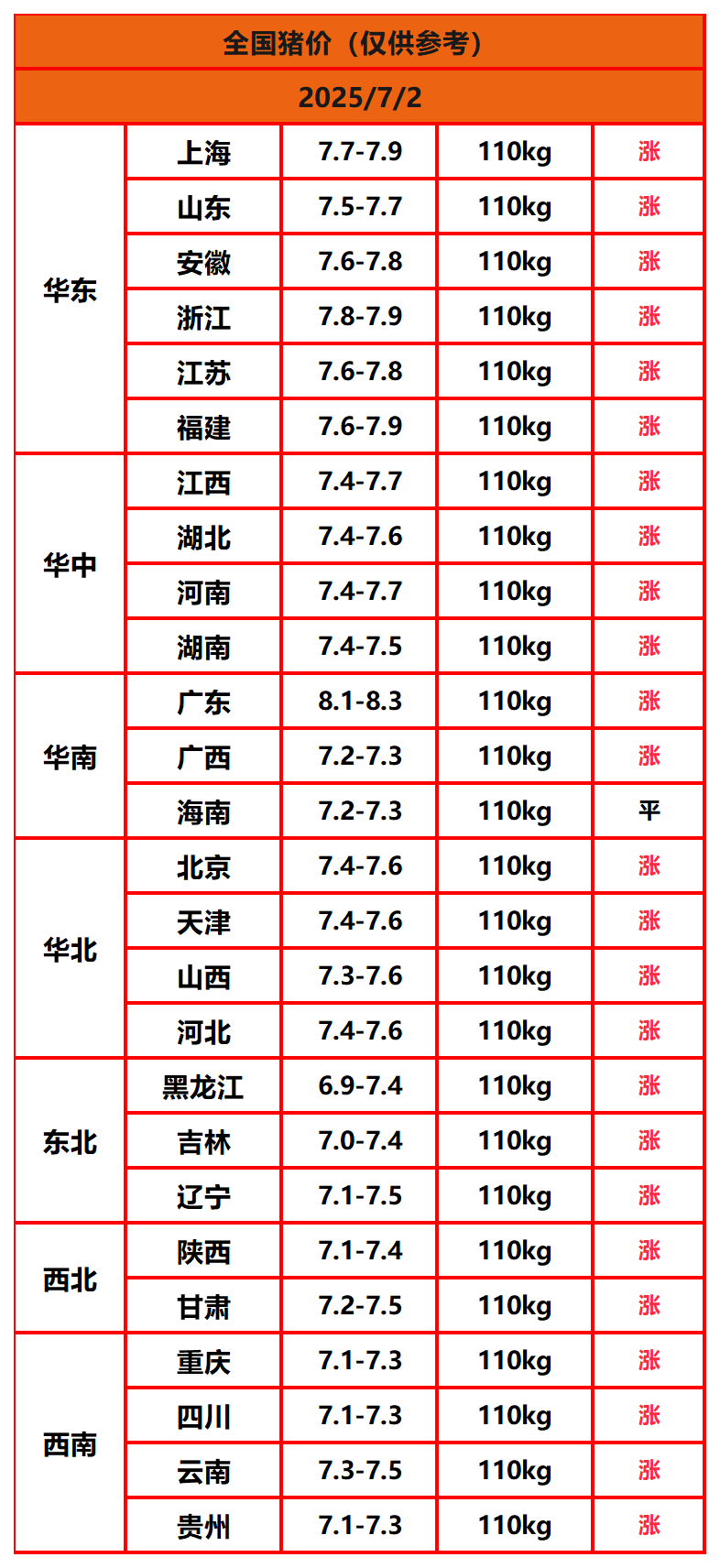 2025年7月2日猪价,今日全国猪价行情走势:25涨1平0跌。