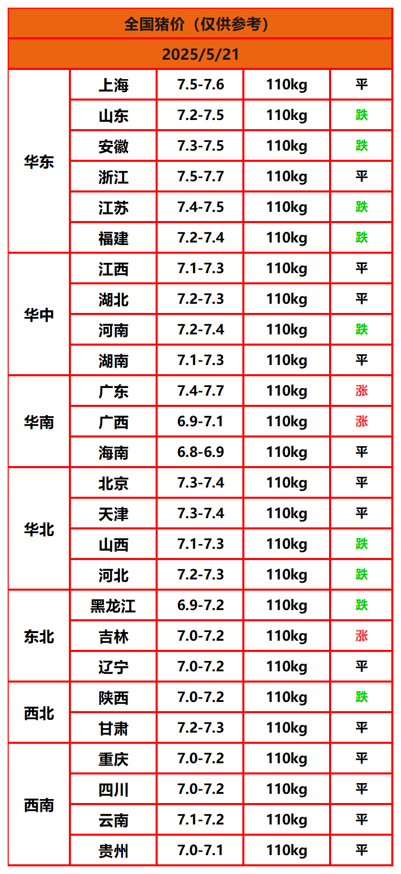2025年5月21日猪价,今日全国猪价行情走势:3涨14平9跌。
