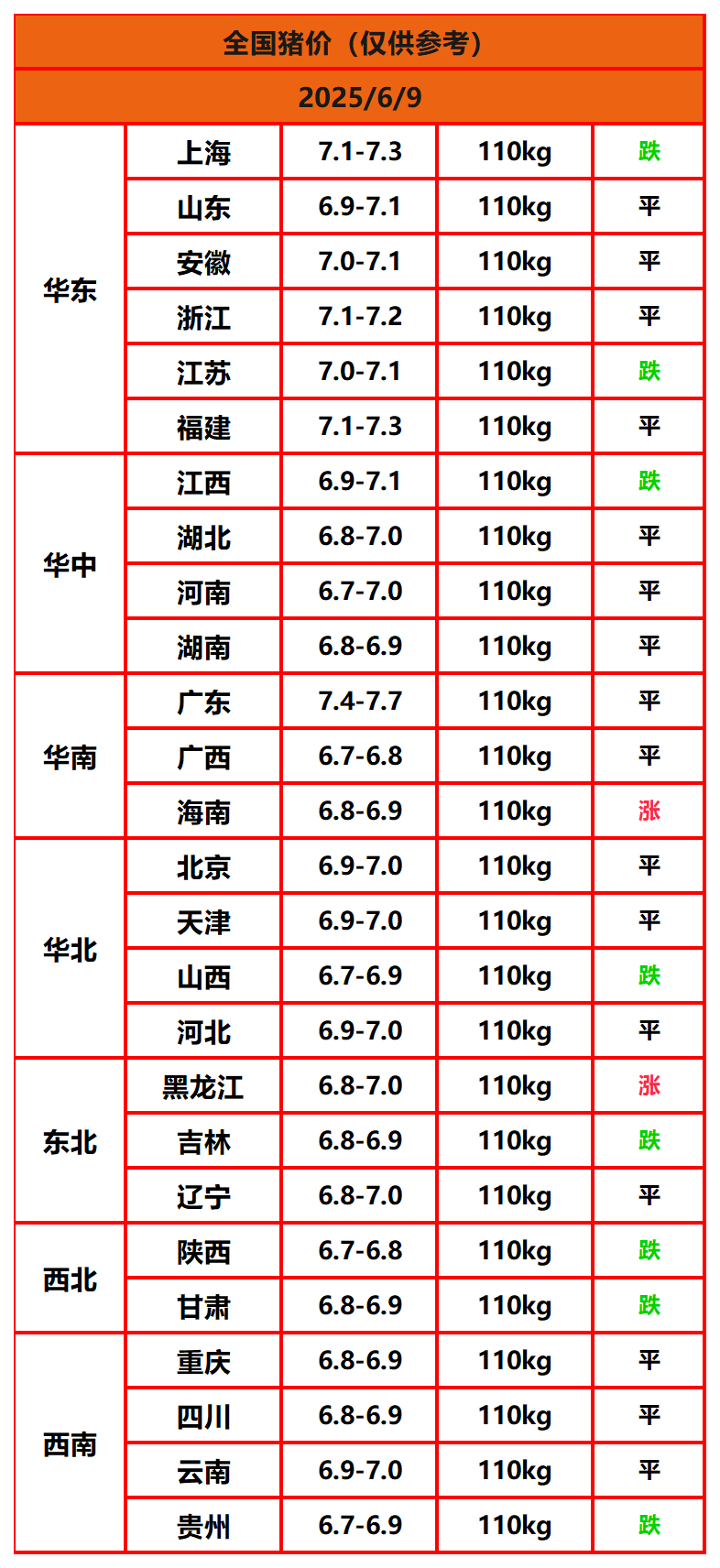 2025年6月9日猪价,今日全国猪价行情走势:2涨16平8跌。